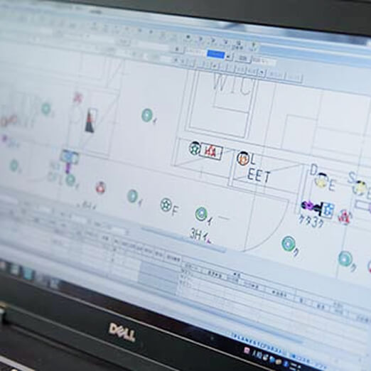 | プロット図面作成、配線図作成補助 | 設計図を基にしたゼロからのプロット図作成、先輩指導のもと配線図作成 | 建物全体の構造を意識し、他工種との干渉を考慮した「生きた図面」が描けるようになる |