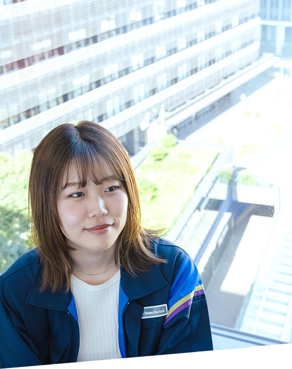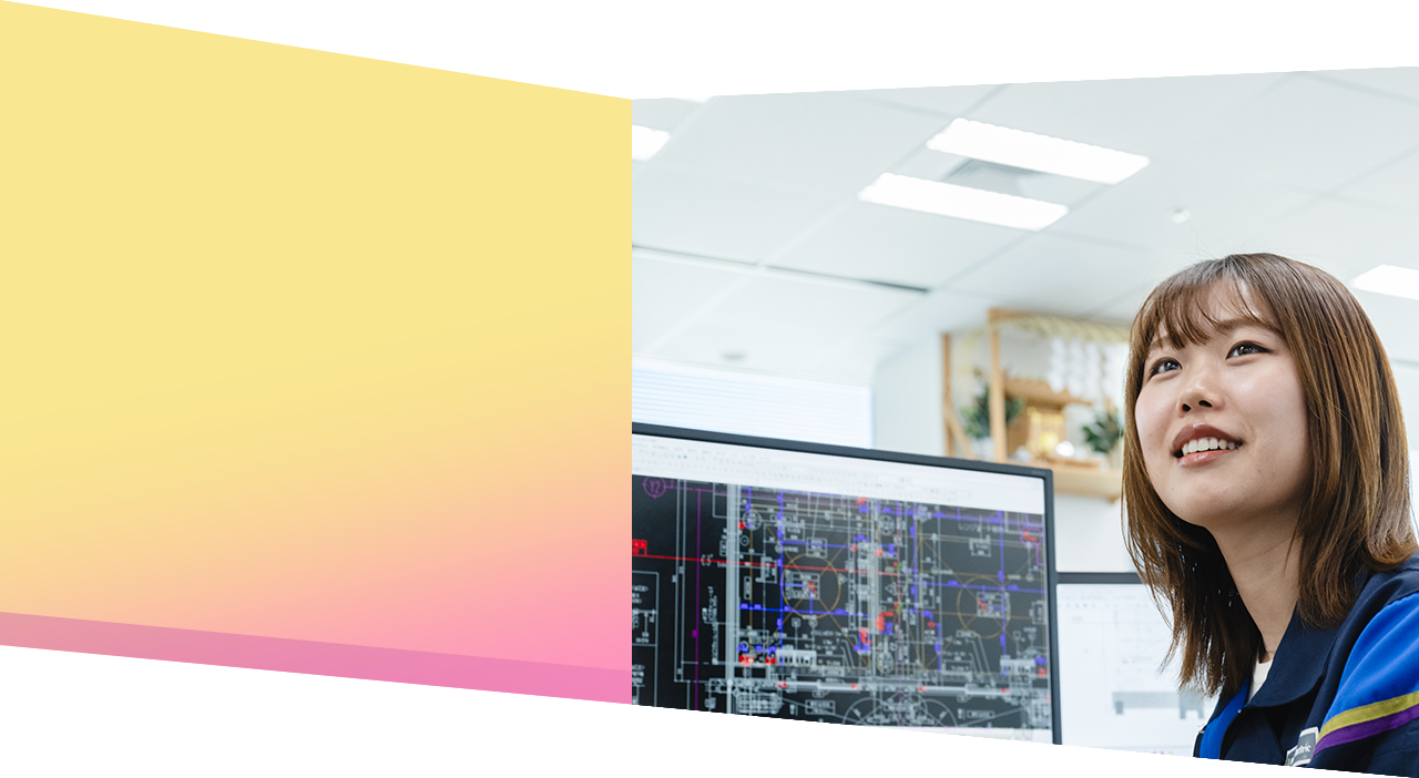 入社以来、工事部工務課に勤務。基本的には東京支店でCADを駆使して図面の作成を行っているが、2021年1〜2023年1月までの2年間は日本橋のマンションの現場事務所にて経験を積んだ。第二種・第一種電気工事士免許、消防設備士(甲種4類)取得。